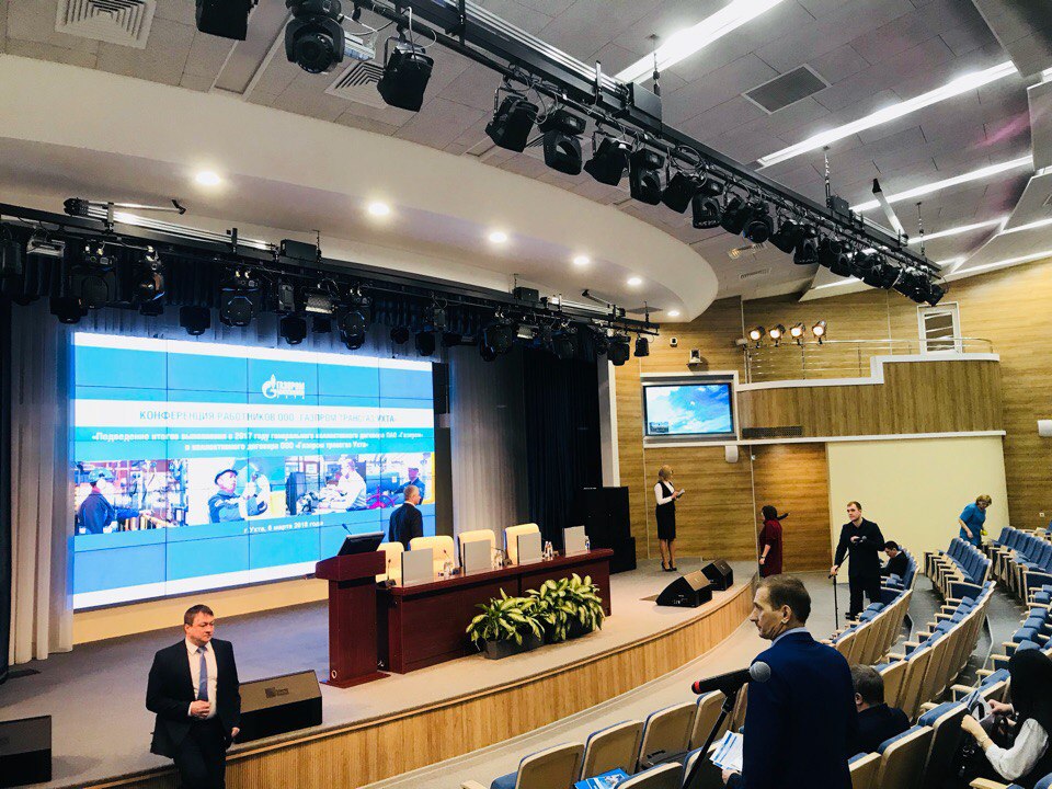 Совместно с компанией Imlight оборудовали актовый зал Актовый зал новой штаб-квартиры «Газпром трансгаз Ухта». За 24 дня нами был установлен высокотехнологичный комплект верхней механики с системами управления, светотехнический парк, позволяющий проводить не только официальные, но и концертные мероприятия. А благодаря применению современных строительных акустических материалов и, конечно, грамотной инсталляции звукового комплекта, зал имеет прекрасные акустические характеристики